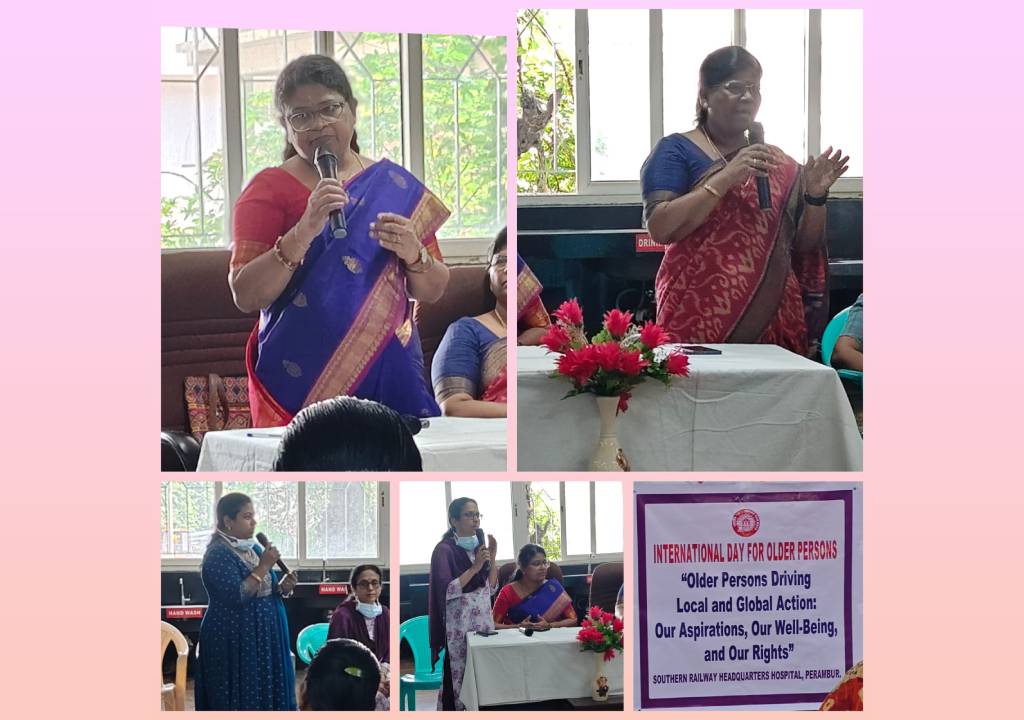 On October 7th, 2025, International Day for the Older persons (October 1st) was observed at the Out Patient Department of Southern Railway Headquarters New Hospital Complex, Perambur. Dr.J.Chitra,CSS/Admin/RH/Per, Dr.A.Priya Shaunthini,CSS/RH/Per and Dr.K.P.Lalitha, ACHD/Health and Family welfare, presided over the function along with other medical officers.